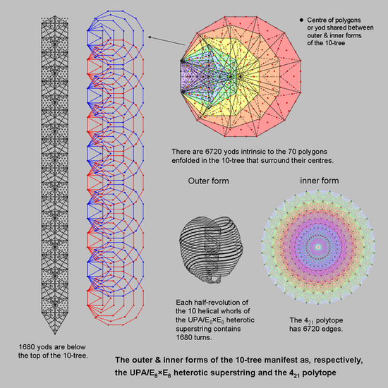Tree of life Superstring theory part 46Stephen M PhillipsFeb 19, 20174 min readUpdated: Sep 27, 2020 Confirmation that the number (6720) of edges of the 421 polytope appears in the inner form of 10 overlapping Trees of Life is provided by their yod population. A set of seven enfolded Type B polygons has 687 yods. Seven of these yods (denoted in the diagram above by black yods) are their centres. Another six black yods that line the two vertical sides of sectors of each hexagon are shared with Type A triangles in the outer Tree of Life because they lie on its side pillars. Two yods on the root edge are associated with each set of seven enfolded polygons (the two yods associated with the left-hand set of polygons not shown in the picture are coloured black). This means that the number of yods associated with each set that are unshared with the outer Tree of Life and which surround the centres of the polygons = 687 − 2 − 7 − 6 = 672. The number of such yods in the 70 polygons enfolded on each side of the central Pillar of Equilibrium of 10 overlapping Trees of Life = 10×672 = 6720. Each yod in a polygon surrounding its centre that is intrinsic to the inner form of 10 Trees of Life corresponds to an edge of the 421 polytope.Constructed from Type A triangles, the 10-tree has 1680 yods below its apex (for proof, see #2). They denote the 1680 turns in a half-revolution of all 10 helical whorls of the UPA, the subquark state of the E8×E8 heterotic superstring. Each yod in the outer form of the lowest 10 Trees of Life denotes one circularly polarized oscillation of a whorl made in a half-revolution of the 10 whorls around the axis of the UPA. Surrounding centres of the (70+70=140) polygons enfolded in the 10-tree are 6720 pairs of corresponding yods that belong solely to them. 140 is the number value of Malachim (or Melekim), the Order of Angels assigned to Tiphareth at the centre of the Tree of Life. There are also 12 black yods per set of seven polygons that are either centres or yods on a side pillar shared with the outer Tree of Life, so that both sets of polygons have (12+12=24) black yods. Hence, there are 240 such yods in the 140 polygons enfolded in the 10-tree that are either shared or centres of polygons. They denote the 240 vertices of the 421 polytope, the 120 black yods in each set of 70 polygons denoting the 120 vertices in each half of the 421 polytope, whilst the 6720 unshared yods surrounding their centres correspond to the 6720 hexagonal yods on the 3360 edges in each half of the 421 polytope when its 60480 triangular faces are turned into tetractyses. As the 240 vertices of this polytope define the 240 root vectors of E8, here, in the joint appearance of the "mathematical" number 6720 and the paranormally-derived number 1680, is unequivocal evidence that the UPA described by Annie Besant & C.W. Leadbeater is an E8×E8 heterotic superstring. The inner form of 10 Trees of Life is simply a planar representation of the 421 polytope when it is constructed from tetractyses! The 240 yods that are either centres of polygons or shared with the 10 Trees denote its 240 vertices, whilst the 6720 unshared yods surrounding the centres of the 70 polygons in each half of the inner form of 10 Trees denote the 6720 hexagonal yods lining the 3360 edges in each half of the polytope. See also #45.In conclusion: the following correspondences exist between the inner form of 10 Trees of Life and the 421 polytope whose faces are tetractyses:120 corners of 30240 tetractys faces in each half of the 421 polytope↔120 yods in each set of 70 polygons either centres of polygons or shared with outer Trees;6720 hexagonal yods line the 3360 edges in each half of the 421 polytope↔6720 yods unshared with outer 10 Trees that surround centres of each set of 70 polygons;6840 yods line the 3360 edges in each half of the 421 polytope↔6840 yods associated with each set of 70 polygons;13680 yods line the 6720 edges of the 421 polytope↔13680 yods in the 140 polygons of the inner form of 10 Trees of Life.They demonstrate the amazing way in which information embodied in the geometry of the inner form of the Tree of Life is revealed by the tetractys as the template of all sacred geometries. Any suggestion by a sceptic that all four correspondences could arise by chance is ludicrously improbable. The only reasonable conclusion to be draw from these analogous properties is that the 421 polytope can be said to be the polytopic version of the inner form of 10 Trees of Life. But, as it is the representation of the 240 roots of E8, which is part of the symmetry group E8×E8, one of the two symmetry groups of dimension 496 that are free of quantum anomalies, this can mean only that E8×E8 heterotic superstrings really do exist. They are the manifestation in the subatomic world of the Tree of Life blueprint. Its outer form is the superstring itself and its inner form is the 421 polytope, whose vertices represent the roots of the symmetry group E8 describing all its forces other than gravity.